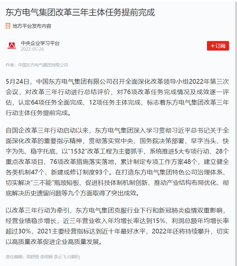 [学习强国]东方电气集团改革三年主体任务提前完成