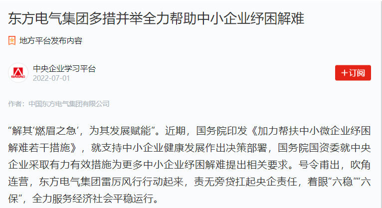 [学习强国]东方电气集团多措并举全力帮助中小企业纾困解难