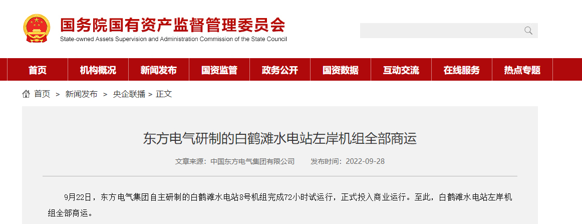 9月22日,东方电气集团自主研制的白鹤滩水电站8号机组完成72小时试运行,正式投入商业运行。至此,白鹤滩水电站左岸机组全部商运。