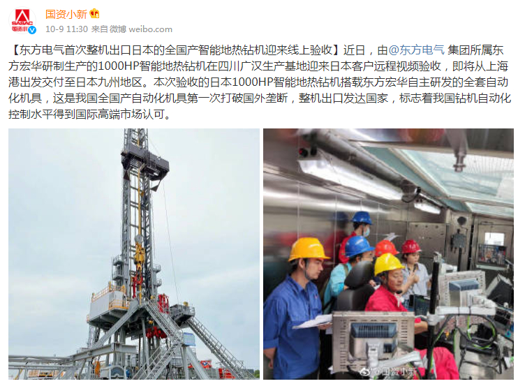 [国资小新]东方电气首次整机出口日本的全国产智能地热钻机迎来线上验收