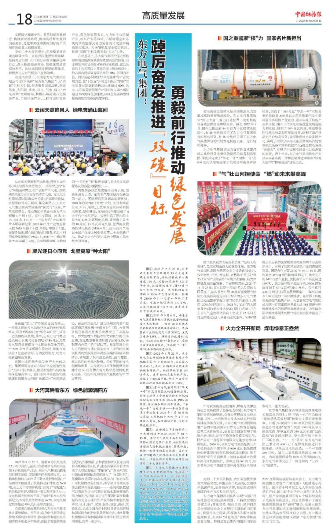 东方电气集团深刻认识实现“双碳”目标是推动我国经济高质量、可持续发展的关键之举;尊重自然、顺应自然、保护自然是全面建设社会主义现代化国家的内在要求。将坚持先立后破,积极融入和服务新型能源体系,扎实以“绿色智造”转型助推高质量发展。特别是在近期四川德阳闭幕的2022世界清洁能源装备大会上,东方电气集团携全球首个二氧化碳+飞轮储能示范项目、国内首个叶片加工无人车间及首条黑灯产线、国内首个定子冲片绿色“无人车间”、氢产业示范展示区等6个精彩纷呈的示范应用场景登场,向全世界展示了清洁能源高端装备的“硬核”魅力,也展示出东方电气集团加快实施创新驱动发展战略,加快实现高水平科技自立自强,为中国以及全球清洁能源建设贡献“东方智慧”的担当与实力。