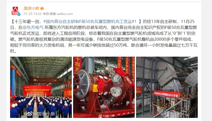 【十三年磨一剑,#国内首台自主研制F级50兆瓦重型燃机完工发运#!】历经13年自主研制,11月25日,在@东方电气所属东方汽轮机的燃机总装车间内,国内首台完全自主知识产权的F级50兆瓦重型燃气轮机正式发运,即将进入工程应用阶段,标志着我国在自主重型燃气轮机领域完成了从“0”到“1”的突破。燃气轮机是极其复杂的清洁能源发电设备,F级50兆瓦重型燃气轮机整机由20000多个零件组成,相较于同功率的火力发电机组,其一年可减少碳排放超过50万吨,联合循环一小时发电量超过七万千瓦时。