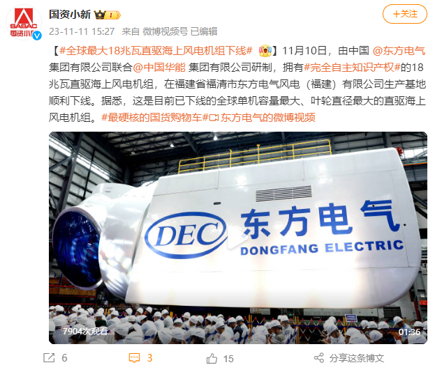 [国资小新]全球最大18兆瓦直驱海上风电机组下线