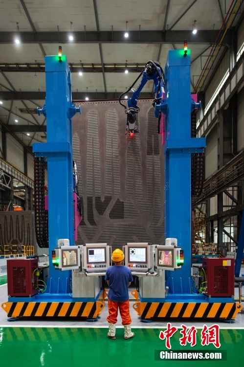 图为车间里的焊接机器人正在进行“铁臂绣花”。
