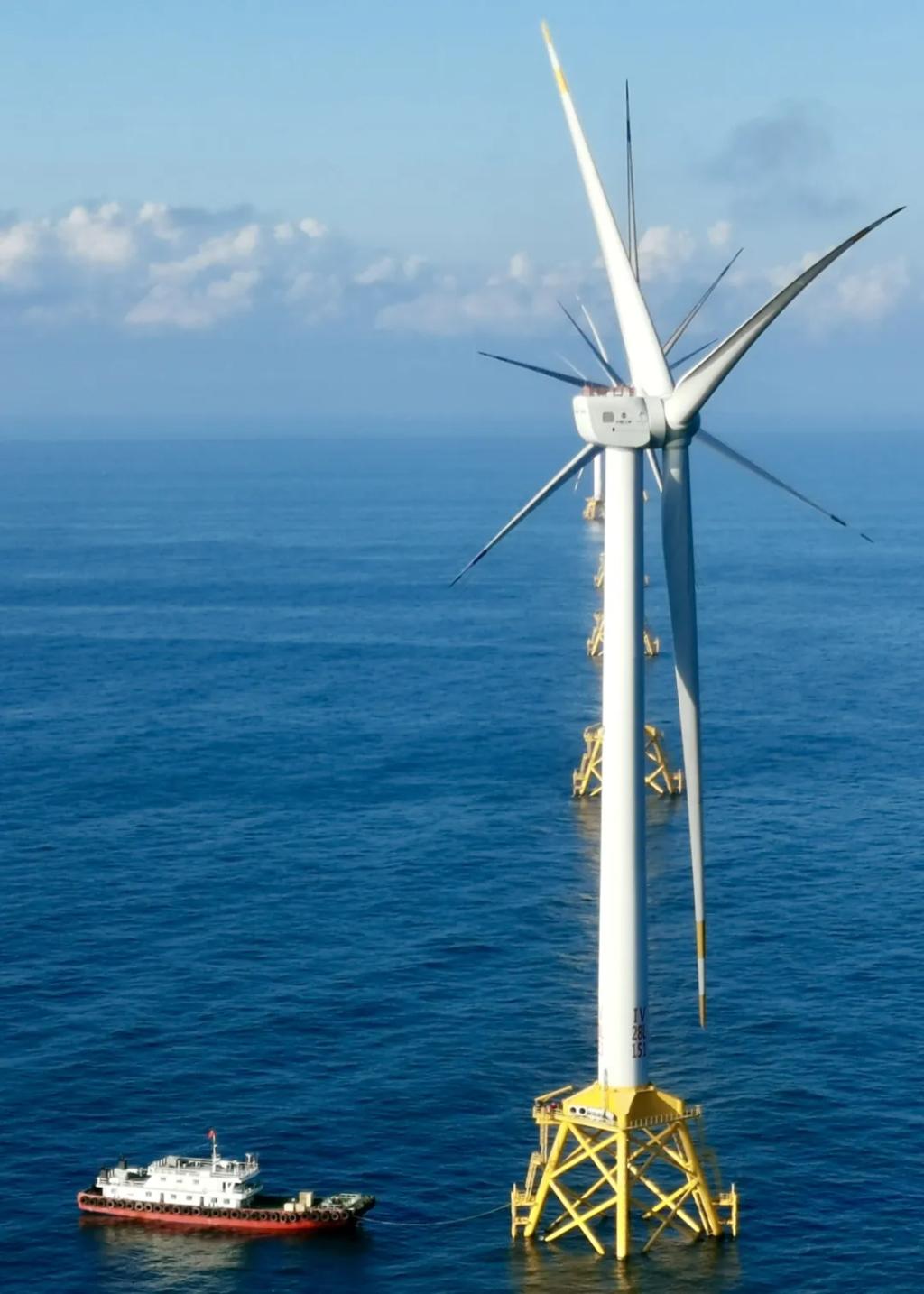 东方电气自主研制的18兆瓦半直驱海上风电机组,是全球在运最大海上风电机组,机组设计、控制策略、机组及部套可靠性进一步优化提升,具备超强的抗台风能力。该机组安装的126米叶片,解决了超长柔性叶片可靠承载技术难题,并基于约束进化算法,实现了叶片的气动性能和载荷重量的最佳匹配,一体化叶片成型工艺,保证叶片在台风中有超强表现。该机组塔筒专为抗台风定制化设计,充分考虑抗台风要求,具有抵御17级及以上台风能力。