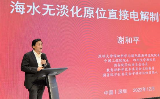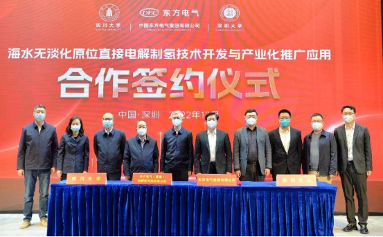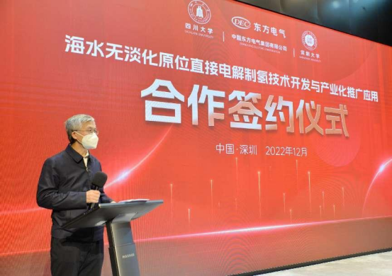 本网讯  12月16日,中国工程院院士谢和平领衔指导的四川大学、深圳大学博士团队与东方电气股份有限公司、东方电气(福建)创新研究院有限公司在深圳签署“海水无淡化原位直接电解制氢原创技术中试和产业化推广应用”的四方合作协议。中国工程院院士谢和平,东方电气集团党组成员、副总经理张彦军,深圳大学副校长汪永成等出席签约仪式。