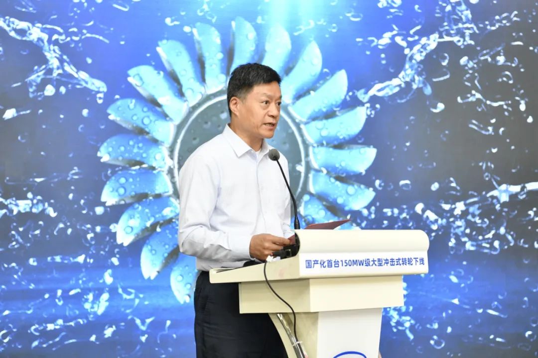 俞培根代表东方电气集团向出席本次活动的领导专家表示热烈的欢迎,对大家长期以来对东方电气集团的关心、支持与帮助表示衷心的感谢,向参与150兆瓦级冲击式转轮国产化研制的全体人员表示热烈的祝贺。他表示,东方电气集团始终秉持产业报国初心和制造强国使命,把科技自立自强作为发展的战略支撑,用实际行动“把关键核心技术牢牢掌握在自己手中”。本次完工下线的国产化首台150兆瓦级冲击式转轮是东方电气集团深入践行国家“双碳”战略、瞄准国内空白和世界一流开展关键核心技术攻关、推动我国能源装备自立自强的具体实践。东方电气集团将持续坚持服务国家战略,与相关单位、创新联合体深入合作,按照既定的“三步走”战略,全力推进巨型冲击式水电机组关键核心技术攻关,不断提高我国能源装备行业核心竞争力,为加快建设科技强国 ,更好服务“双碳”目标作出新的更大贡献。