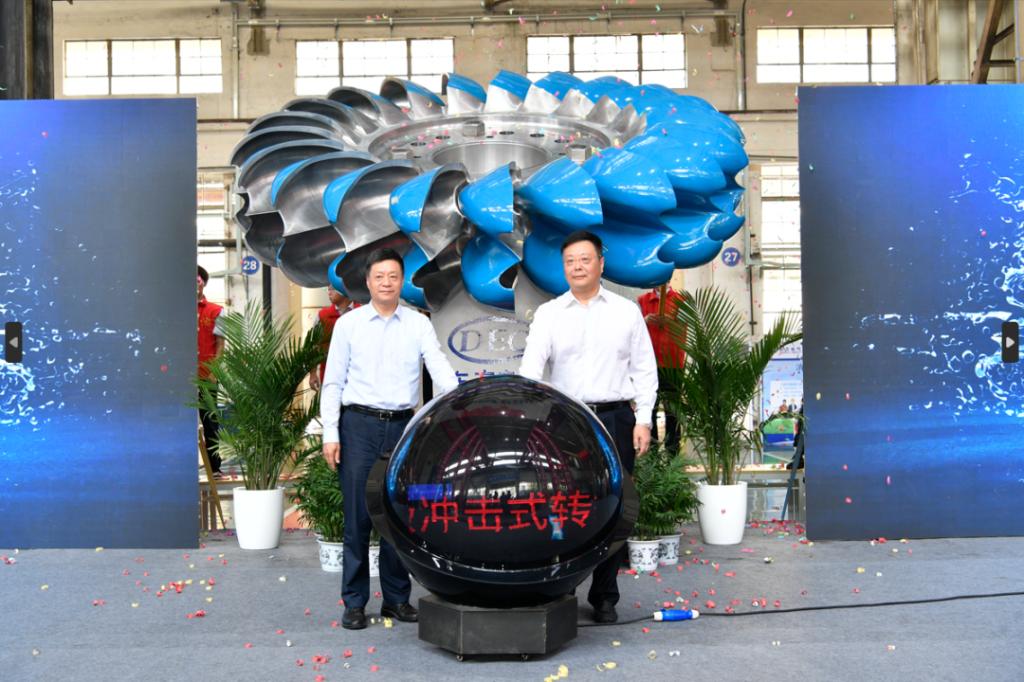 俞培根、李文志共同触摸水晶球,宣告国产化首台150兆瓦级大型冲击式转轮成功下线。