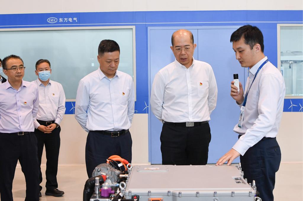 在东方电气集团总部,谭作钧一行深入氢燃料电池示范生产线,乘坐搭载“东方芯”的氢能公交车,参观了科技展示厅,开展了专题调研座谈。