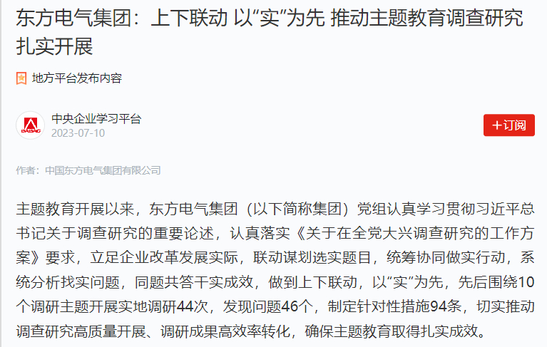 主题教育开展以来,东方电气集团(以下简称集团)党组认真学习贯彻习近平总书记关于调查研究的重要论述,认真落实《关于在全党大兴调查研究的工作方案》要求,立足企业改革发展实际,联动谋划选实题目,统筹协同做实行动,系统分析找实问题,同题共答干实成效,做到上下联动,以“实”为先,先后围绕10个调研主题开展实地调研44次,发现问题46个,制定针对性措施94条,切实推动调查研究高质量开展、调研成果高效率转化,确保主题教育取得扎实成效。